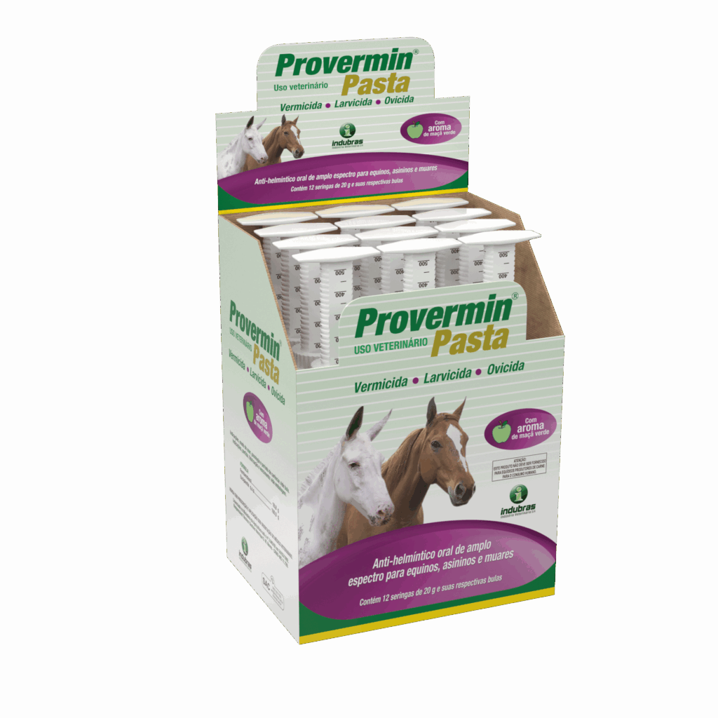 Modo de usar: Medicamento indicado para equinos, asininos e muares. Uso oral, administrar através da seringa graduada, girando o anel da mesma e fixando-o na graduação do êmbolo de acordo com a dose indicada para o animal a ser tratado. Inserir a seringa lateralmente na boca do animal em direção ao fundo da cavidade oral e pressionar o êmbolo, liberando o produto sobre a língua. Observar se não contém restos alimentares na boca do animal (feno, capim ou ração), para que não haja perda do medicamento.