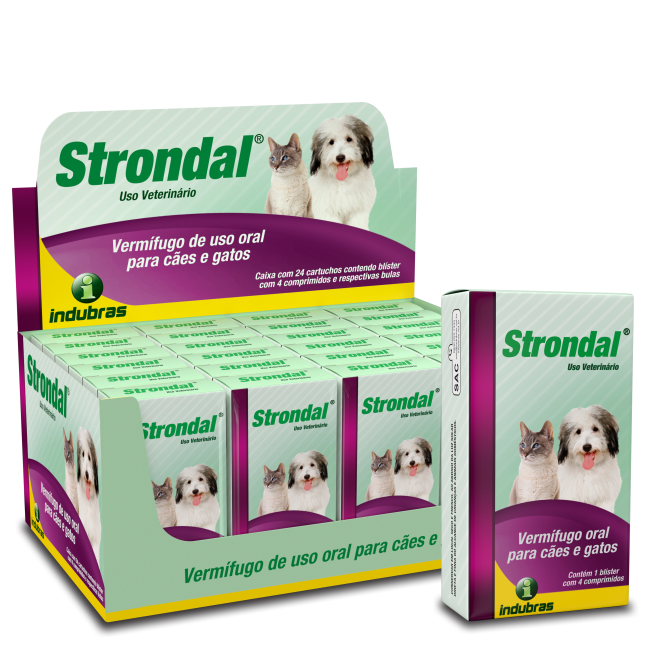 A dosagem recomendada é de 5mg de Praziquantel por Kg de peso corpóreo e 14,4mg de Pamoato de Pirantel por Kg de peso corpóreo em dose única, equivalente a um comprimido de Strondal para um animal de 10 Kg de peso corpóreo ou de acordo com a tabela abaixo: