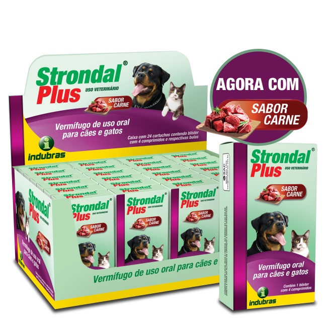 A dosagem recomendada de Fembendazol é de 50 mg por Kg de peso corpóreo, a de Praziquantel é de 5 mg por Kg de peso corpóreo e de Pamoato de Pirantel é de 14,4 mg por Kg de peso corpóreo em dose única, equivalente a um comprimido de Strondal Plus para um animal de 10 kg de peso ou de acordo com a tabela abaixo: